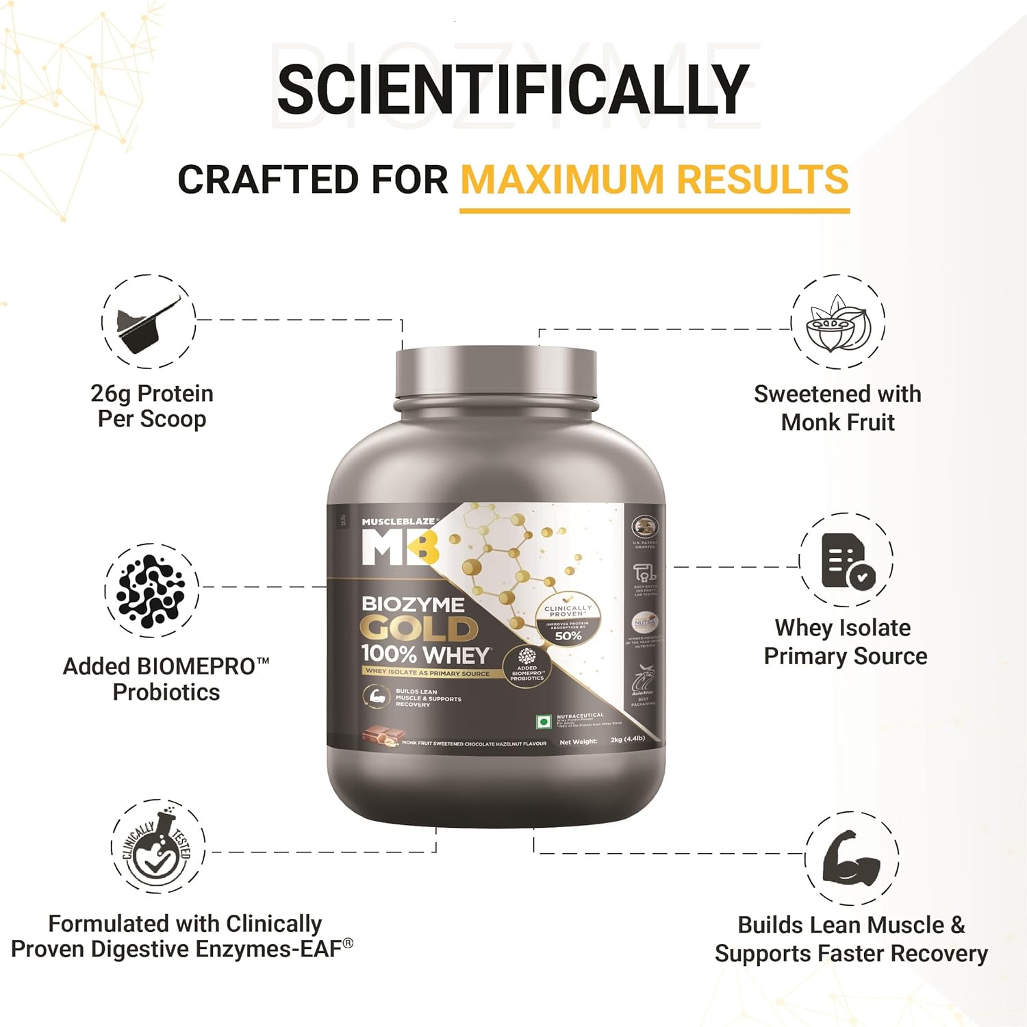 MuscleBlaze Biozyme Gold 100% Whey Protein (Monk Fruit Sweetened Chocolate Hazelnut, 2kg / 4.4 lb) | Whey Isolate as Primary Protein Source