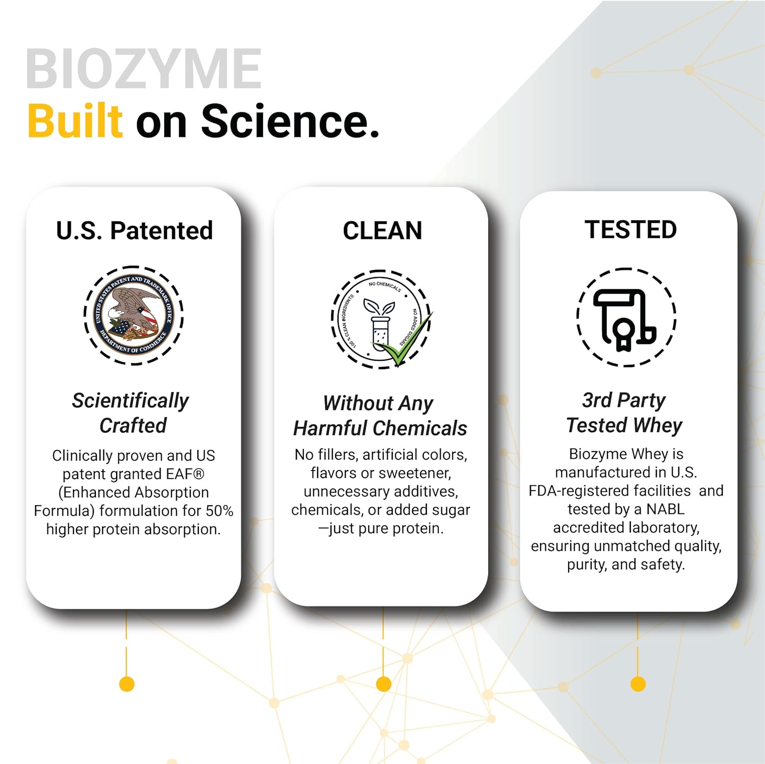 • SCIENCE-BACKED PERFORMANCE WITH PATENTED EAF: Our patented Enhanced Absorption Formula (EAF) is a champion-grade innovation that minimizes protein digestion issues. This clinically proven technology boasts a 50% higher protein absorption rate and a 60% higher BCAA absorption rate than regular whey proteins.